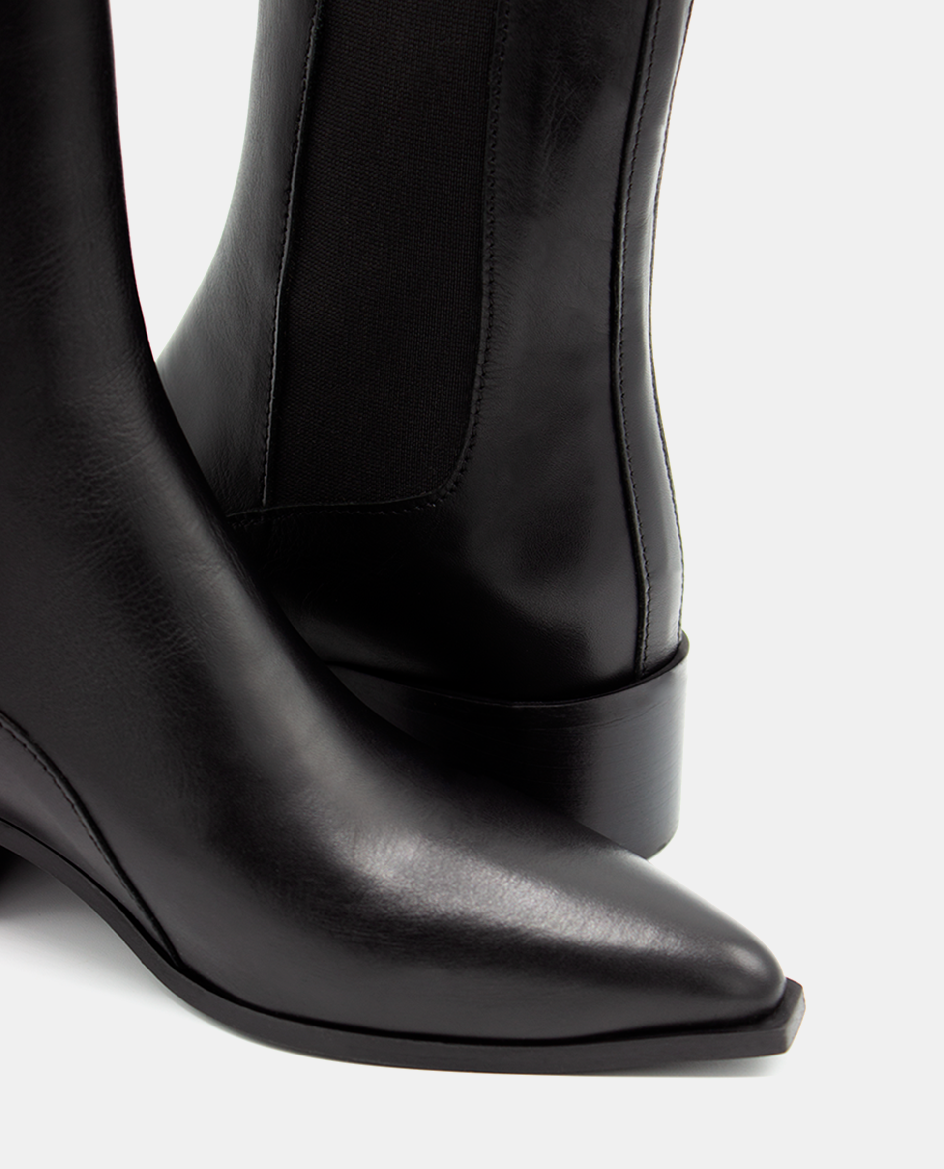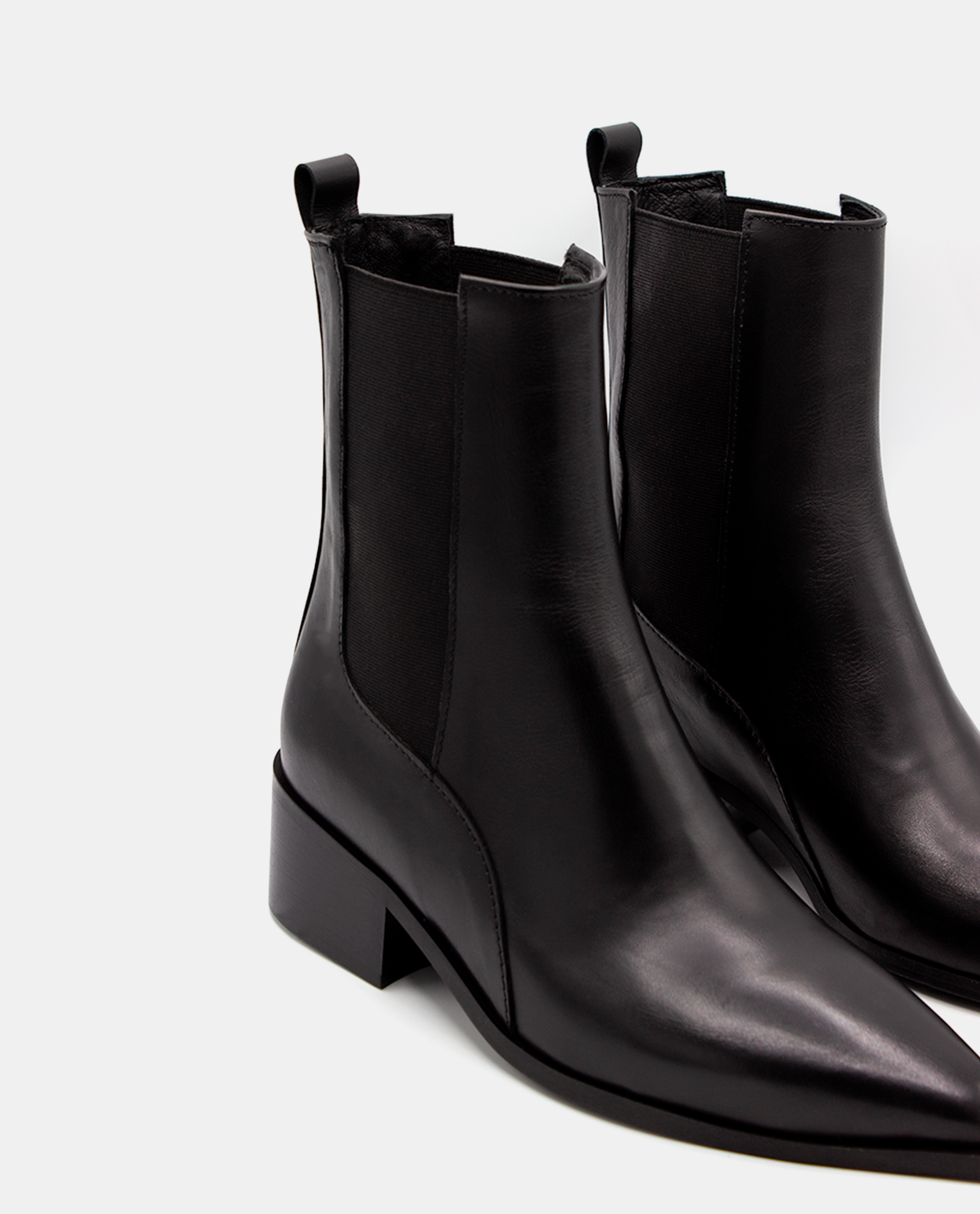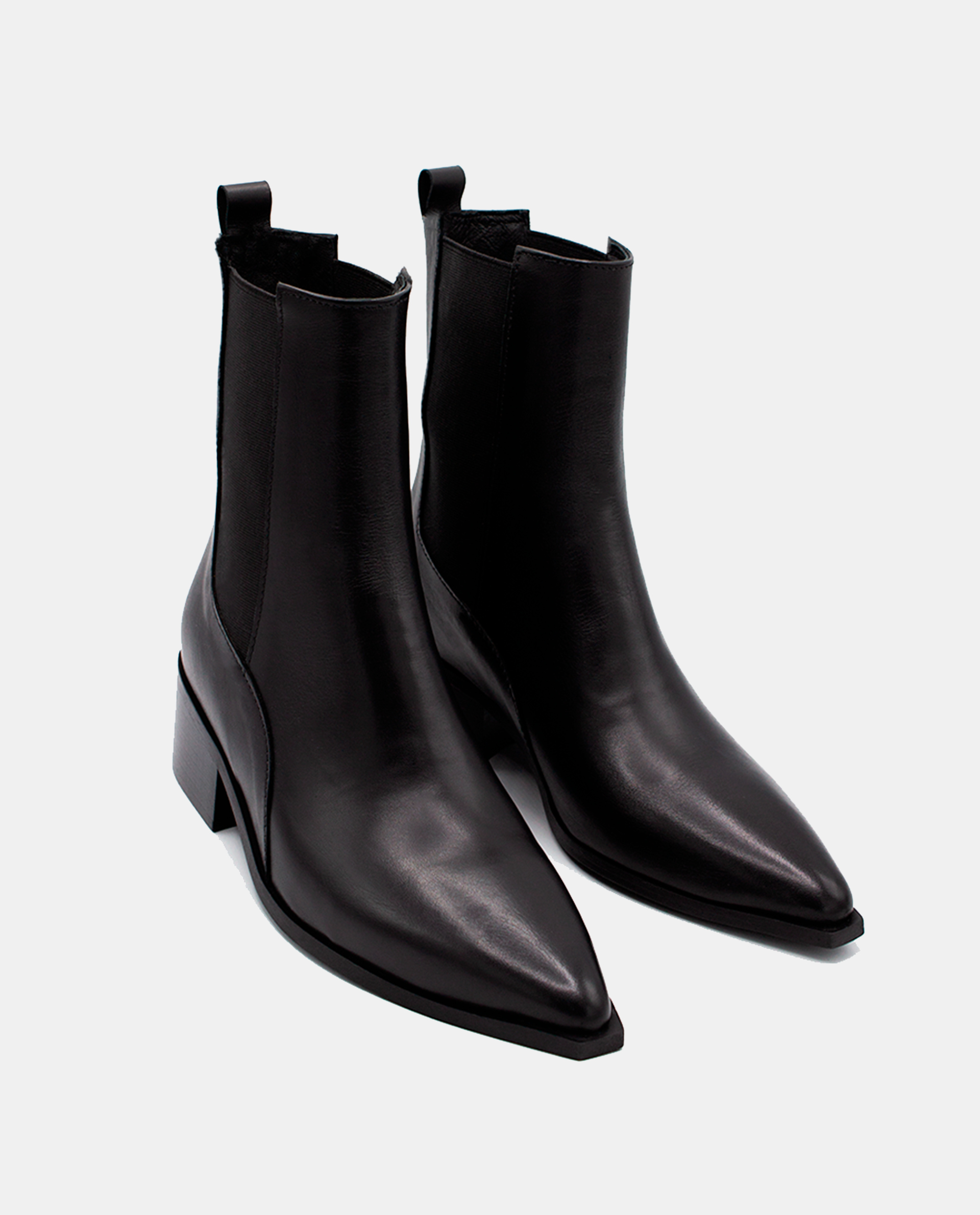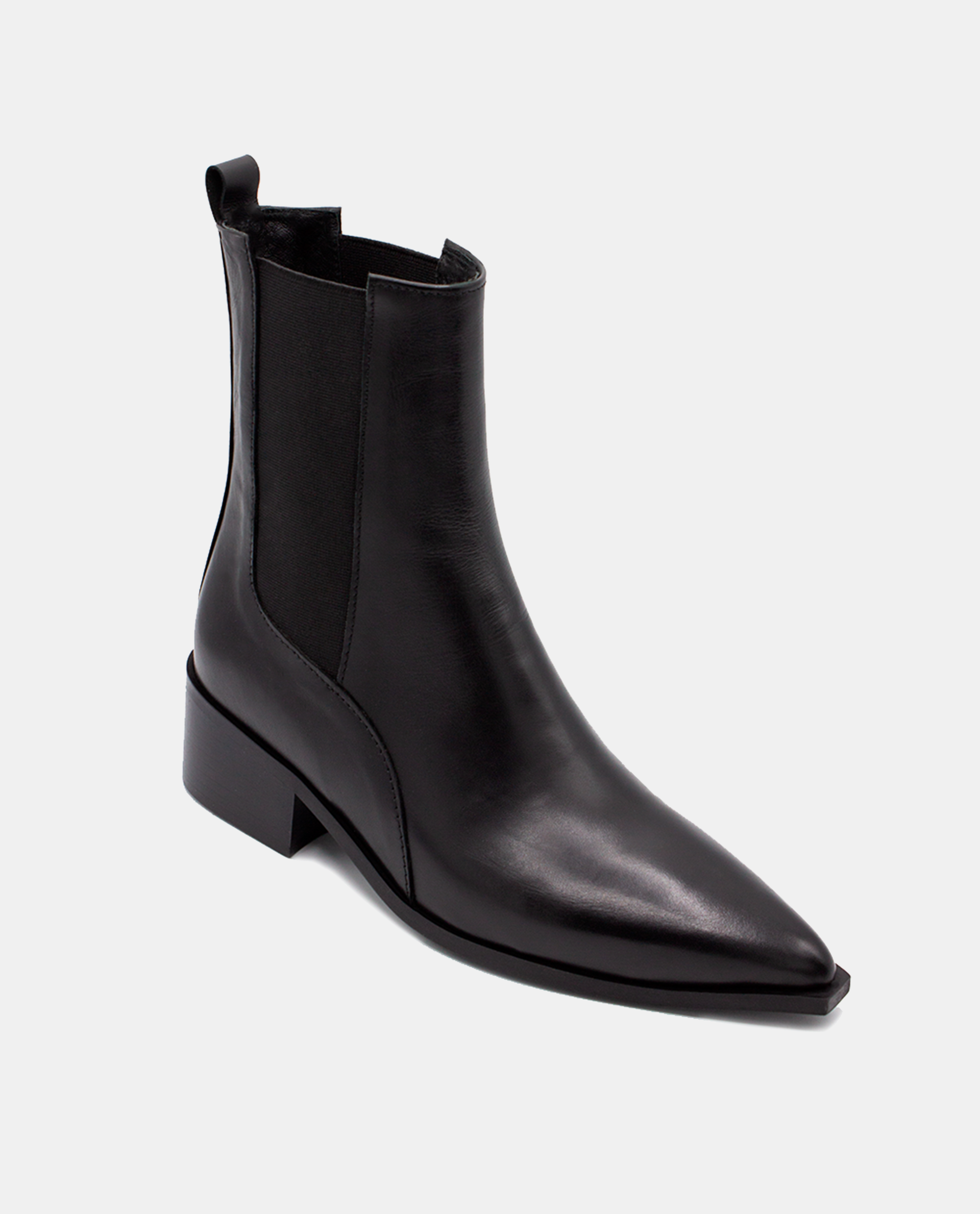 The Black Leather Pointed Ankle Boot is a modern classic designed for timeless wear. Crafted from smooth leather, it features a refined pointed toe and side elastic panels for an easy, comfortable fit. Set on a low, wide heel, this boot combines everyday practicality with sleek sophistication — a versatile essential that complements any wardrobe.