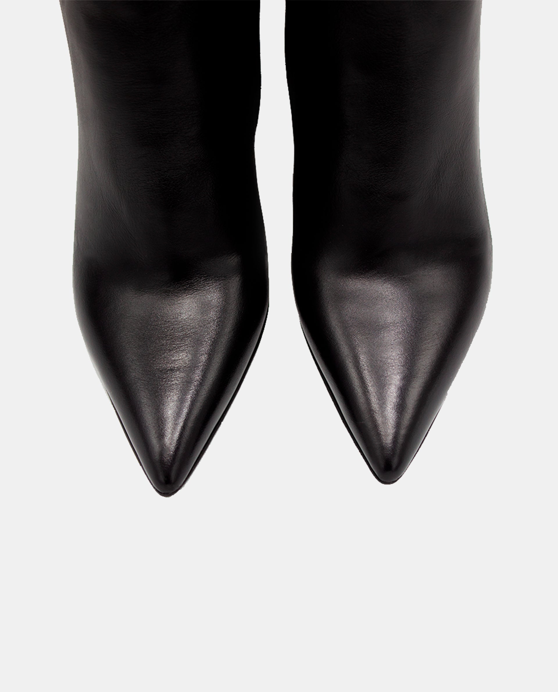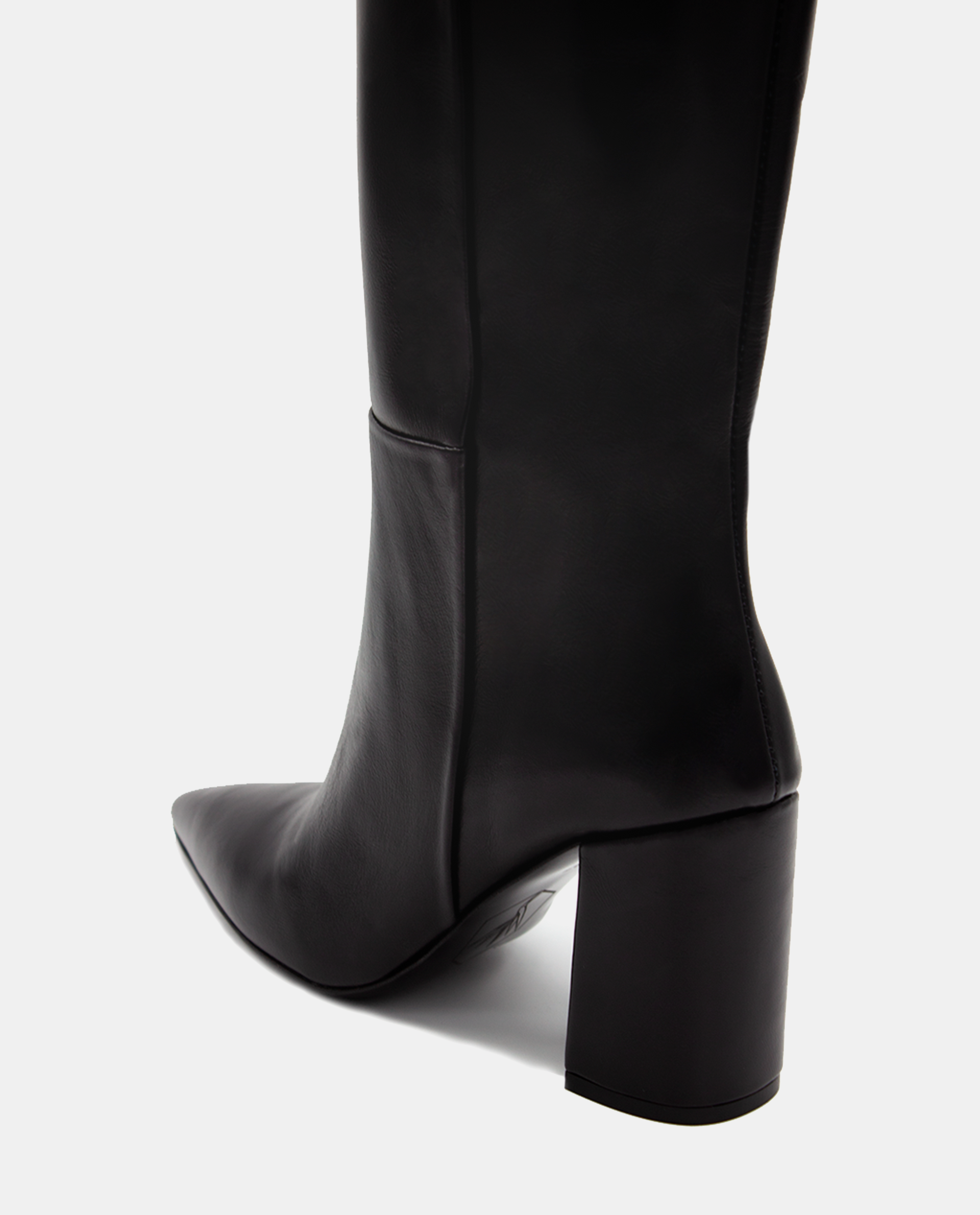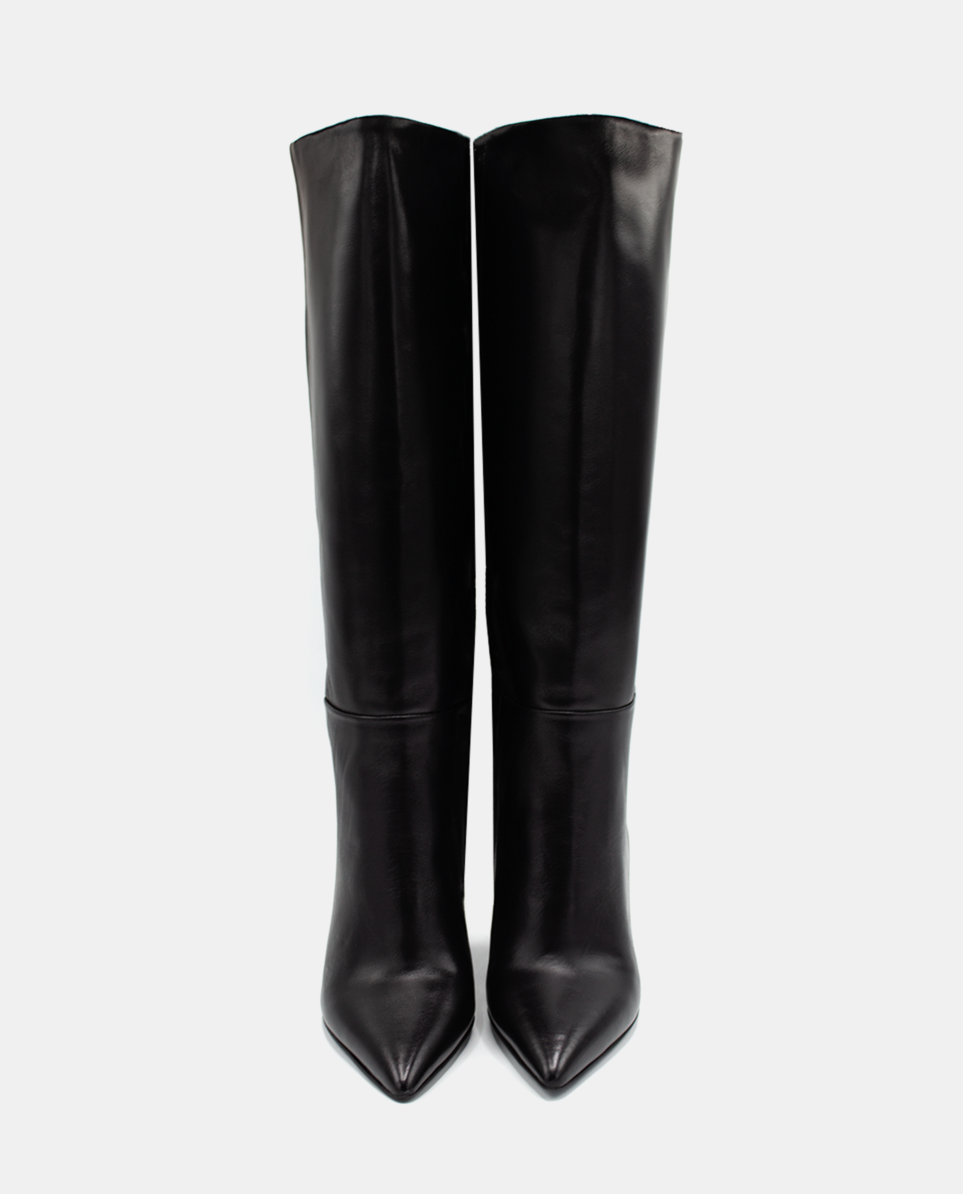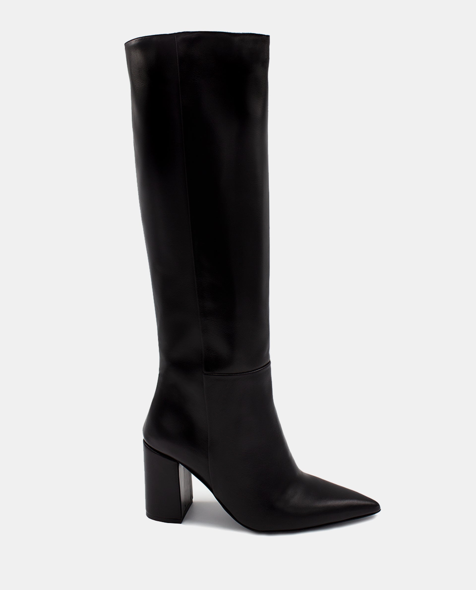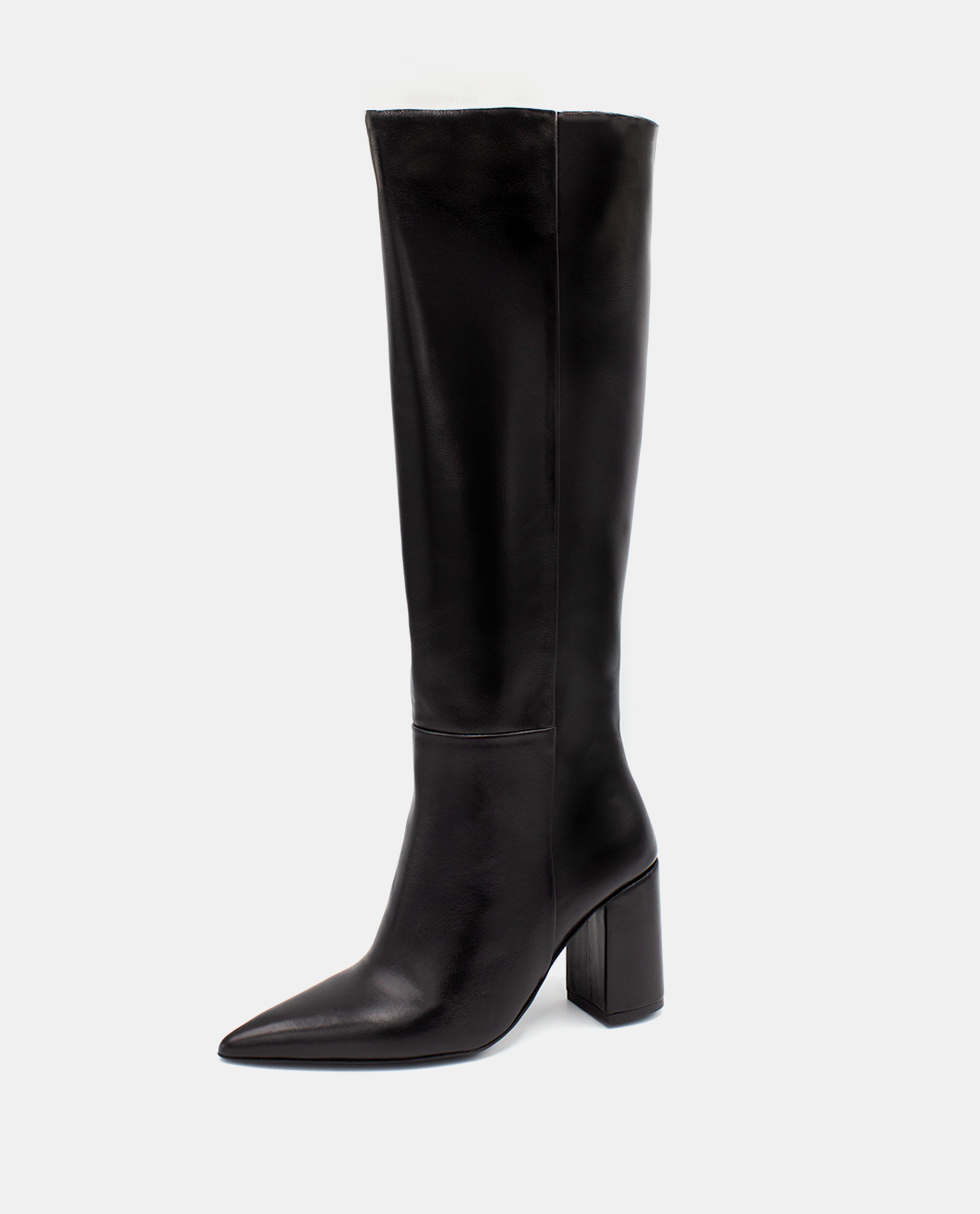 A timeless essential for the modern wardrobe, the Black Leather Knee-High Boot is crafted from smooth genuine leather with a sleek pointed toe and structured silhouette. Designed for both elegance and comfort, it features a mid-height block heel and a side zip closure for ease. The leather lining and insole provide a soft, refined finish — perfect from day to night.