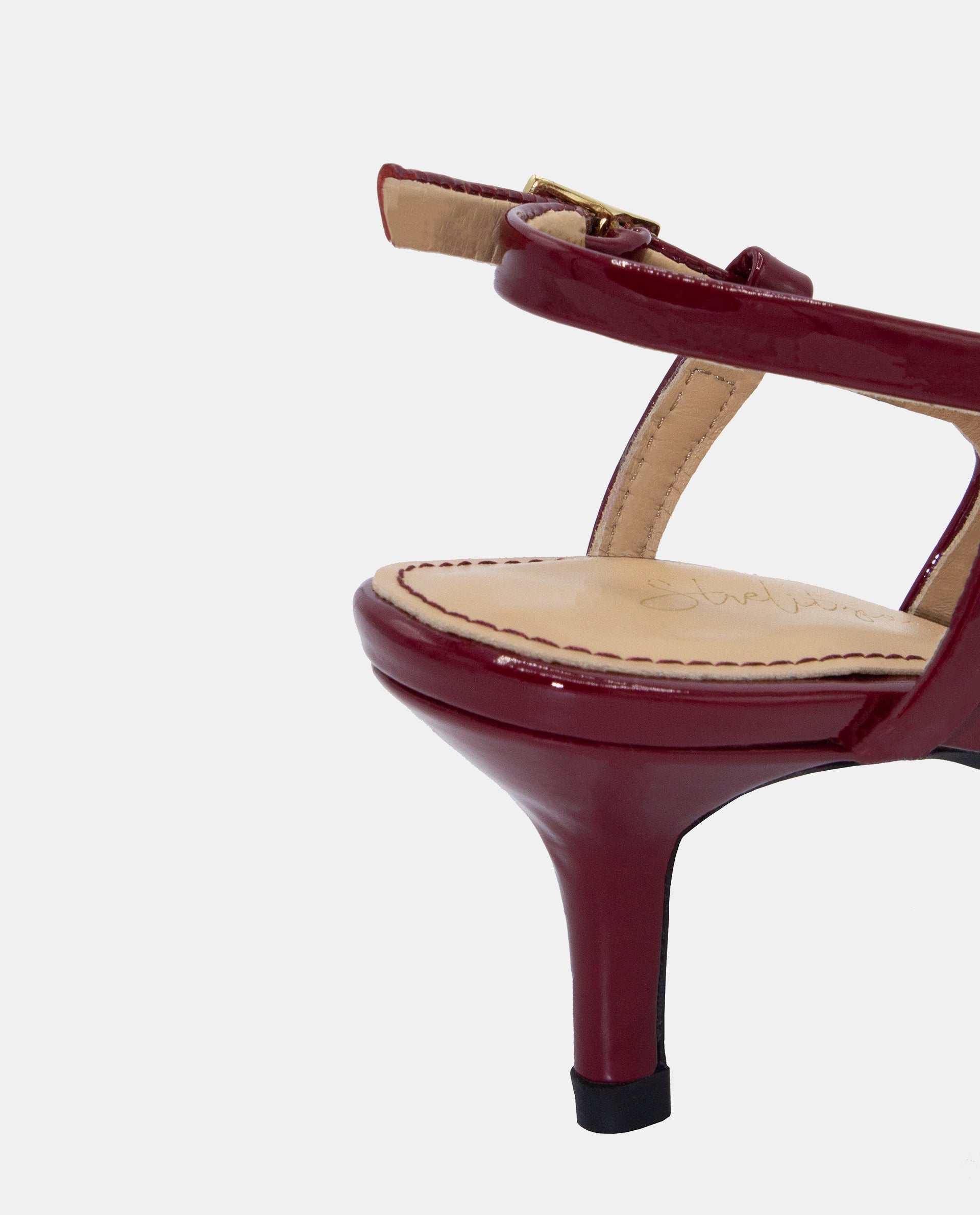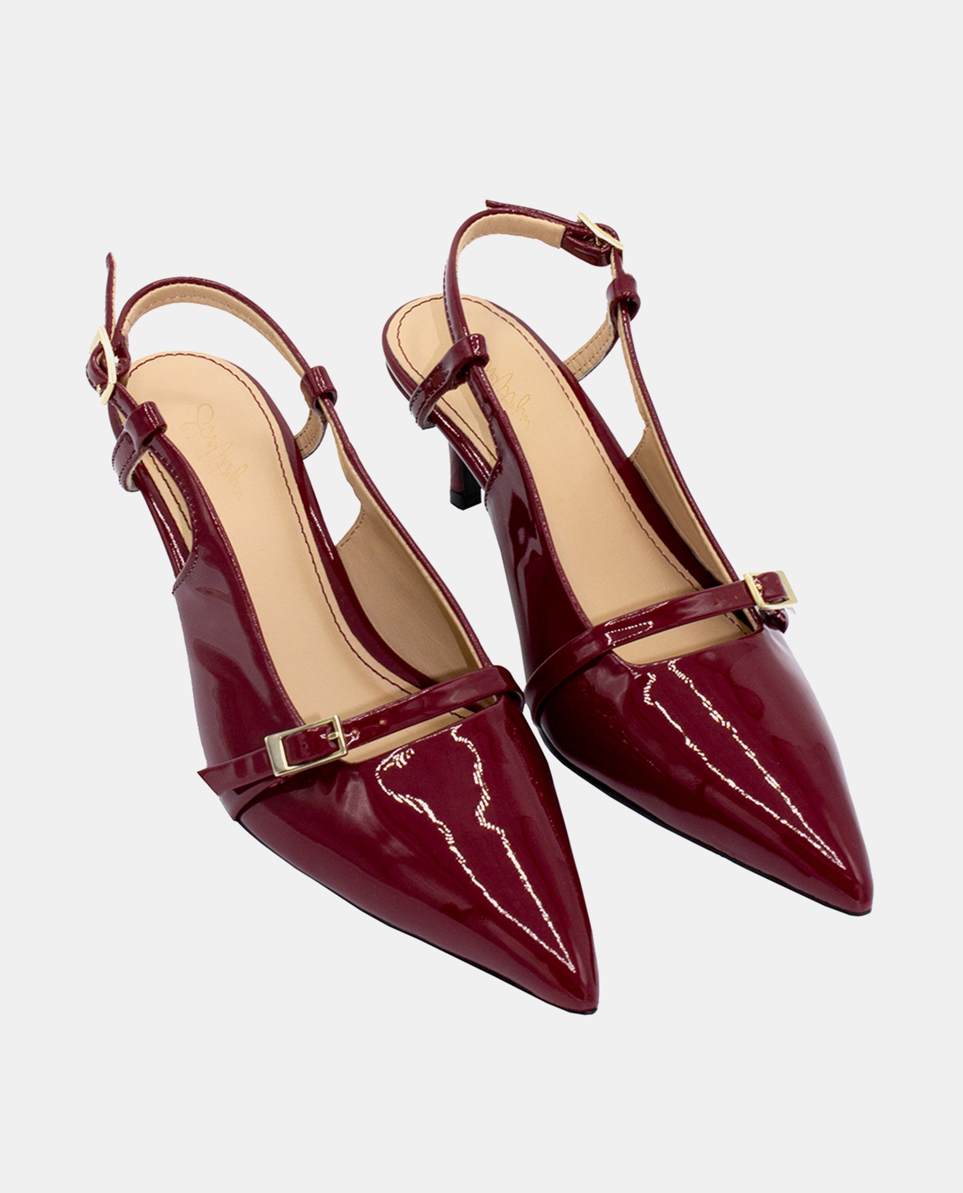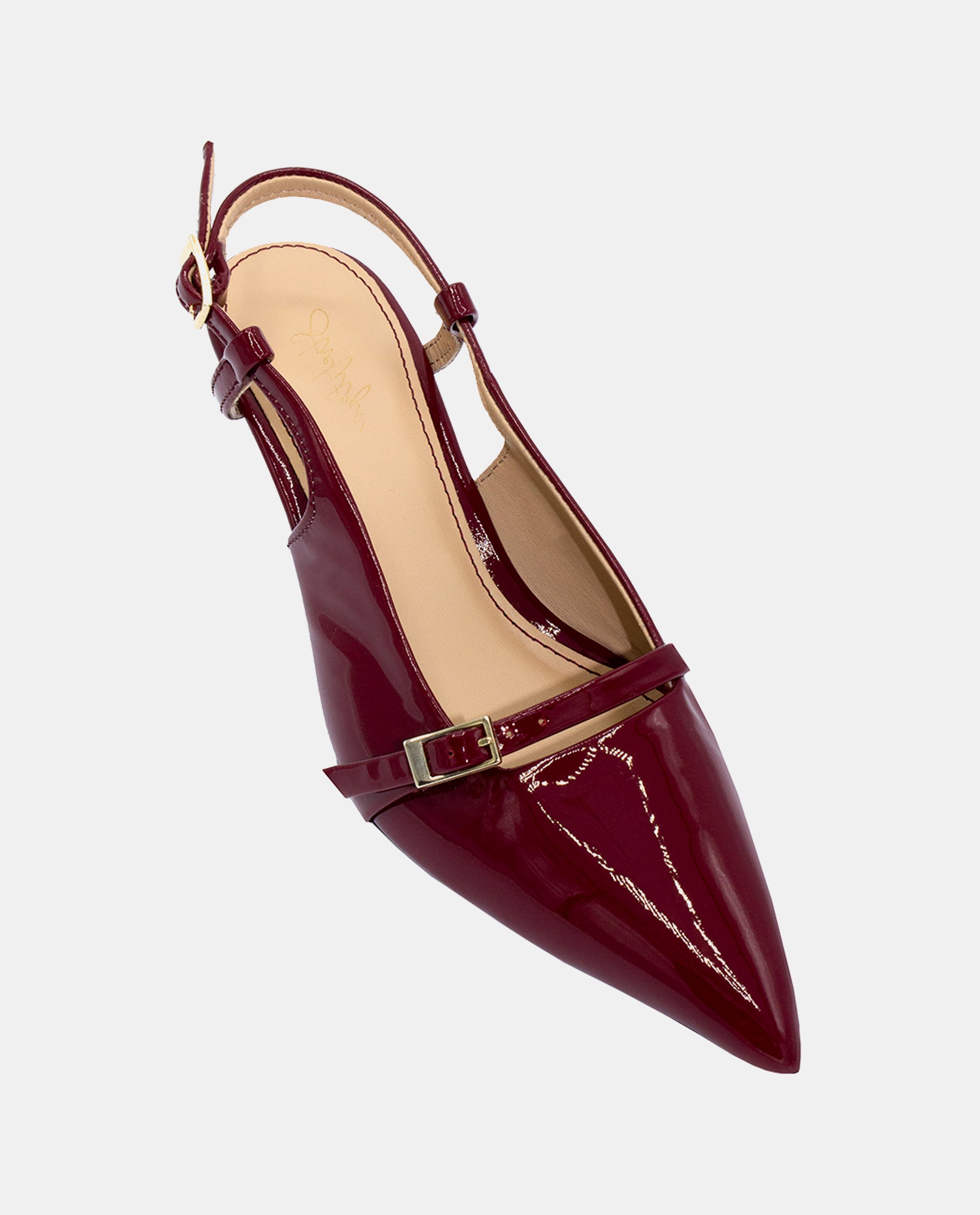 Crafted from glossy cherry-red patent leather, the Cherry Slingback Pump brings together timeless sophistication and modern allure. Designed with a pointed toe and a 5 cm mid-heel, it enhances the silhouette while providing lasting comfort. The adjustable gold-tone buckle straps add a refined touch, while the memory-foam insole ensures a soft, cushioned feel with every step. A versatile piece that transitions seamlessly from day to night.