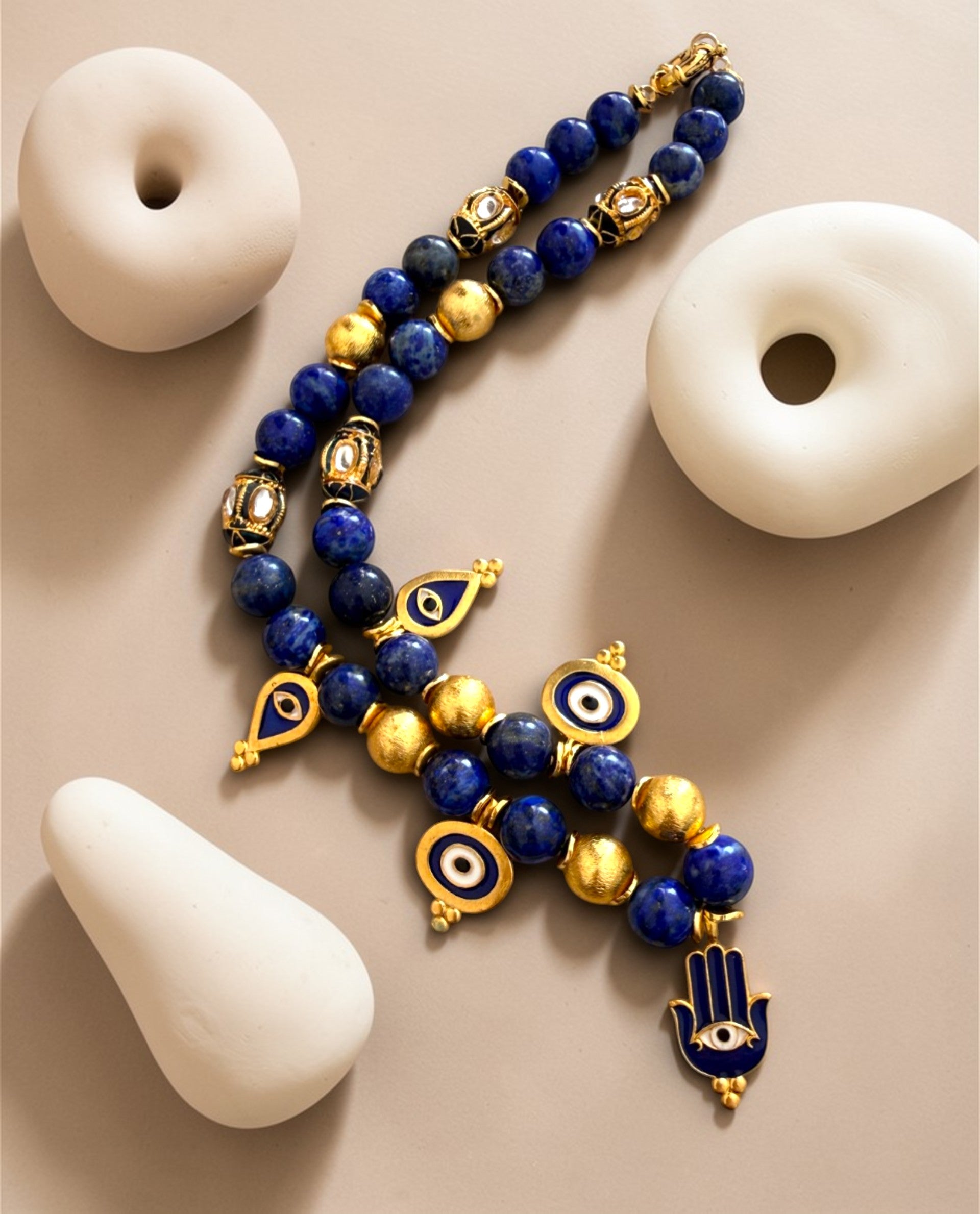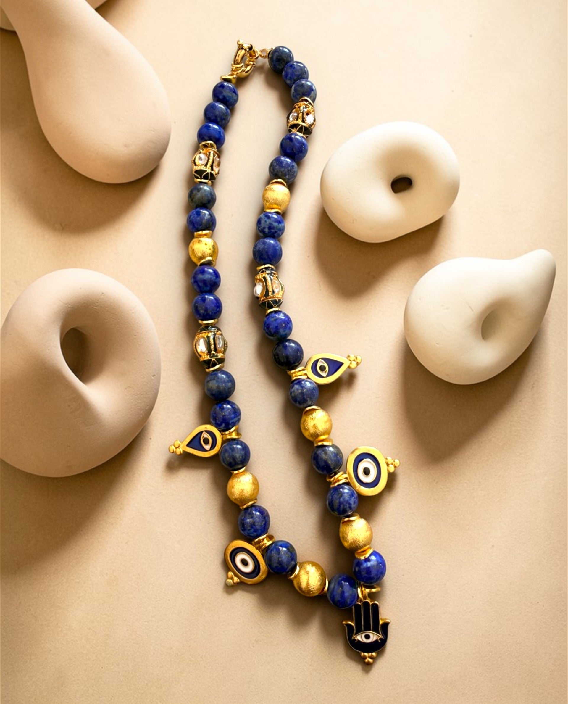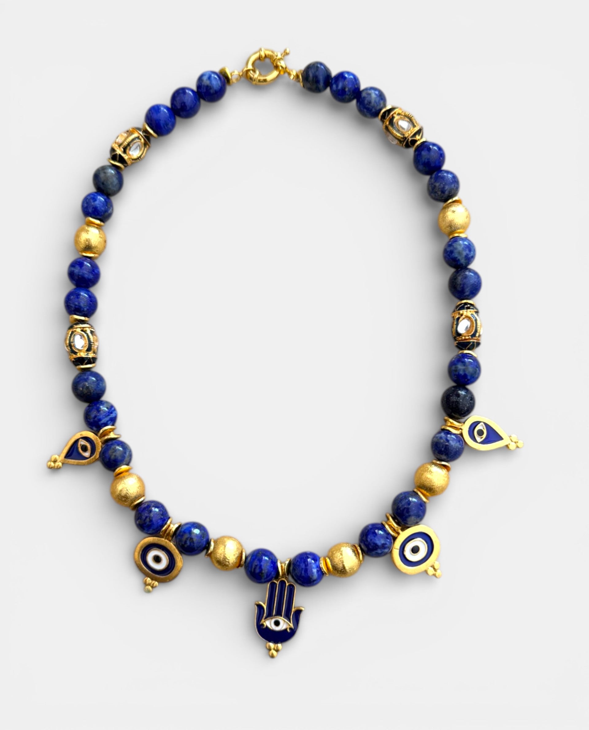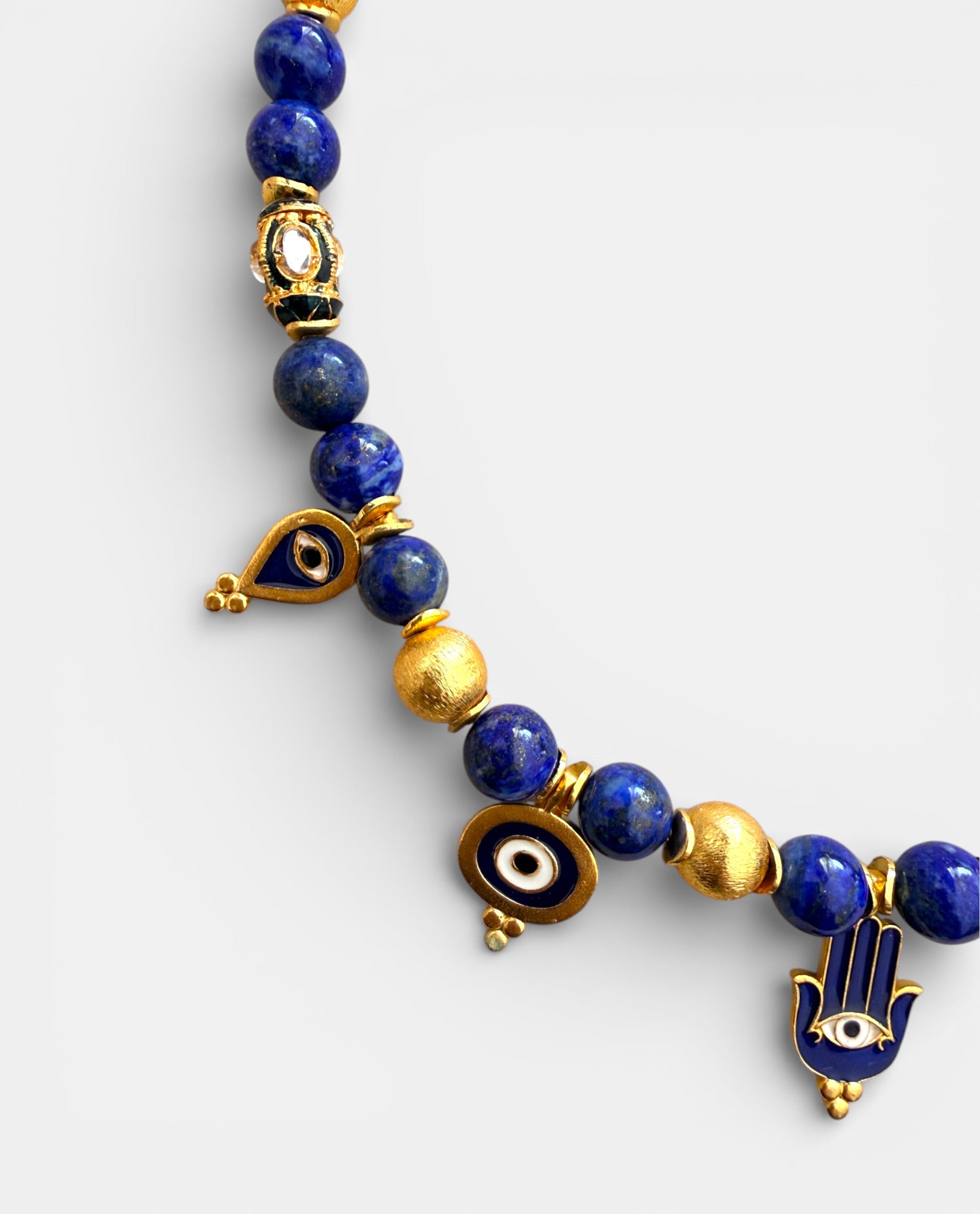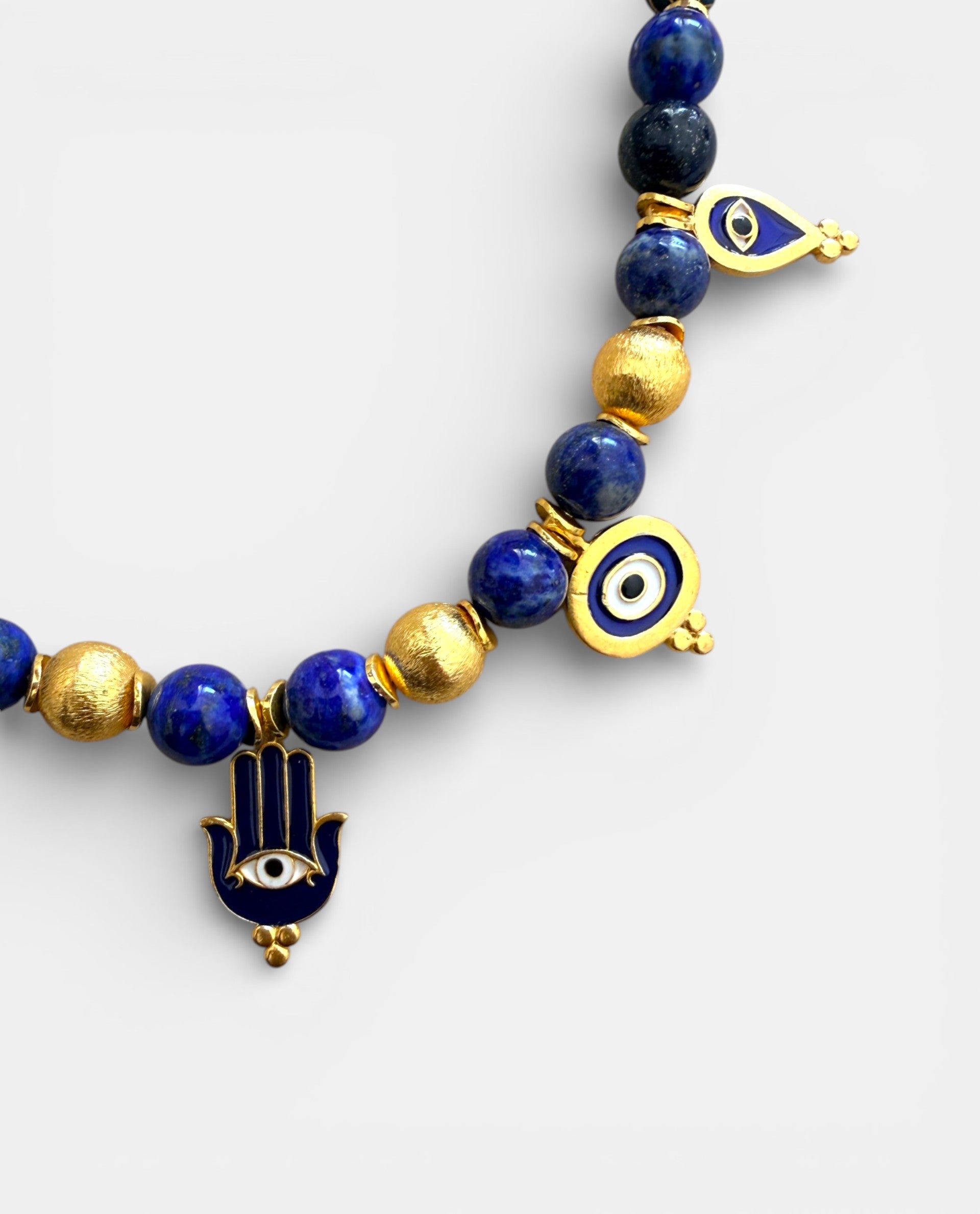• Deep blue natural stones• Gold-tone charms• Evil eye & hamsa talismans• Spring clasp closure• Length: approx. 40–42 cm
