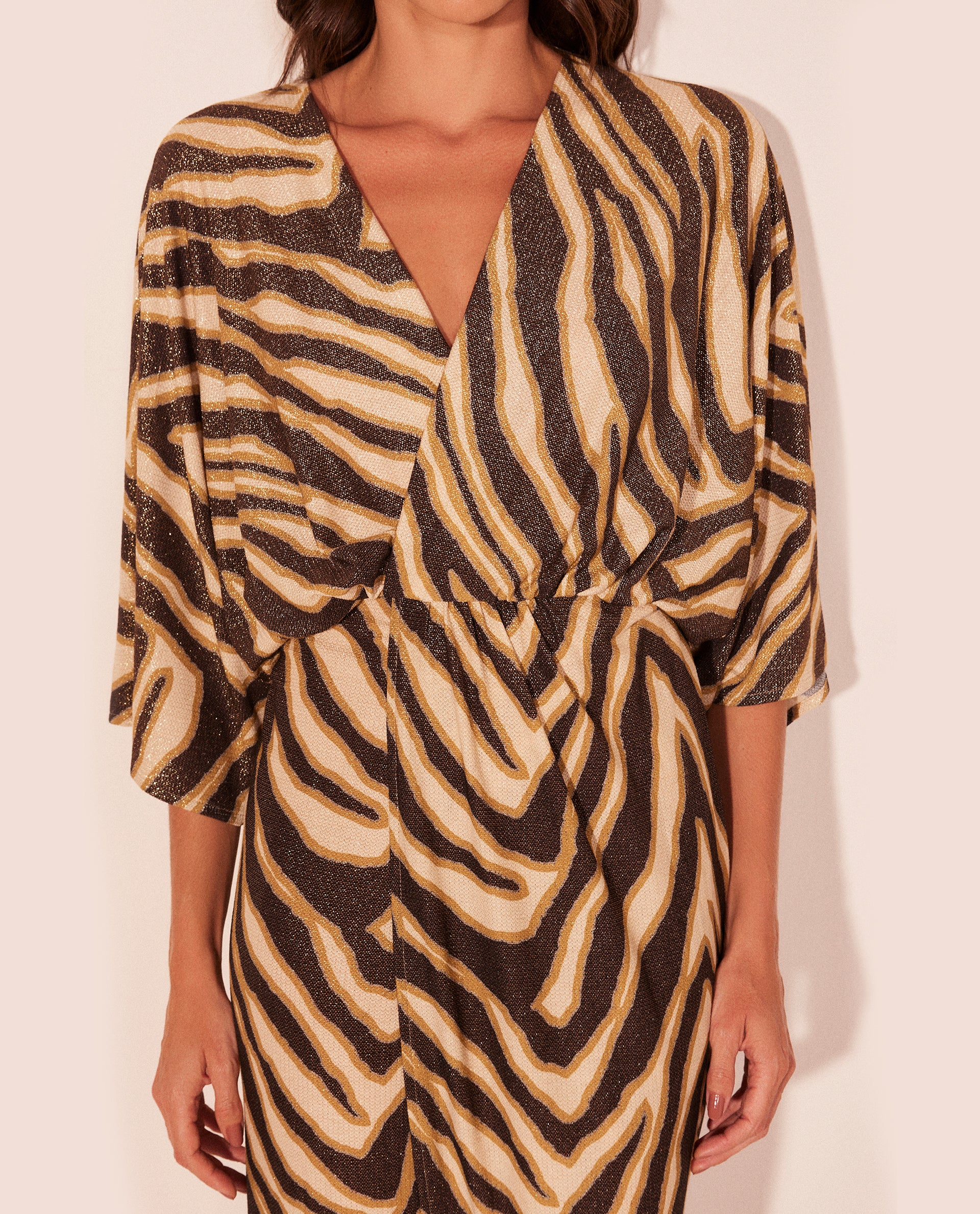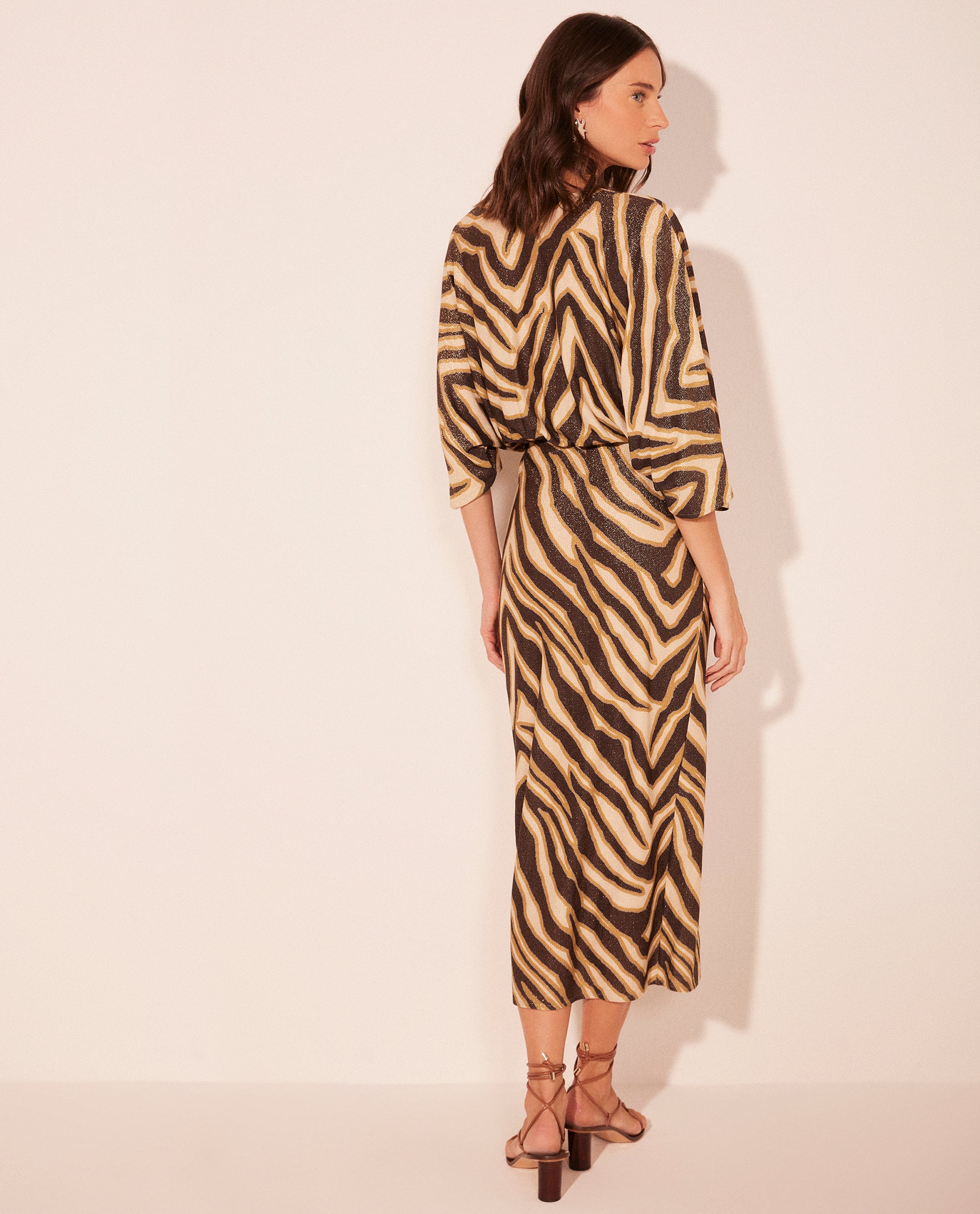 The Oryx Midi Dress, crafted in viscose lurex, features a midi length and a wrap-style V neckline with gathered detailing, creating an elegant and structured silhouette. The straight skirt with a central slit and wide, squared sleeves complete the look with sophistication, making it ideal for refined occasions.