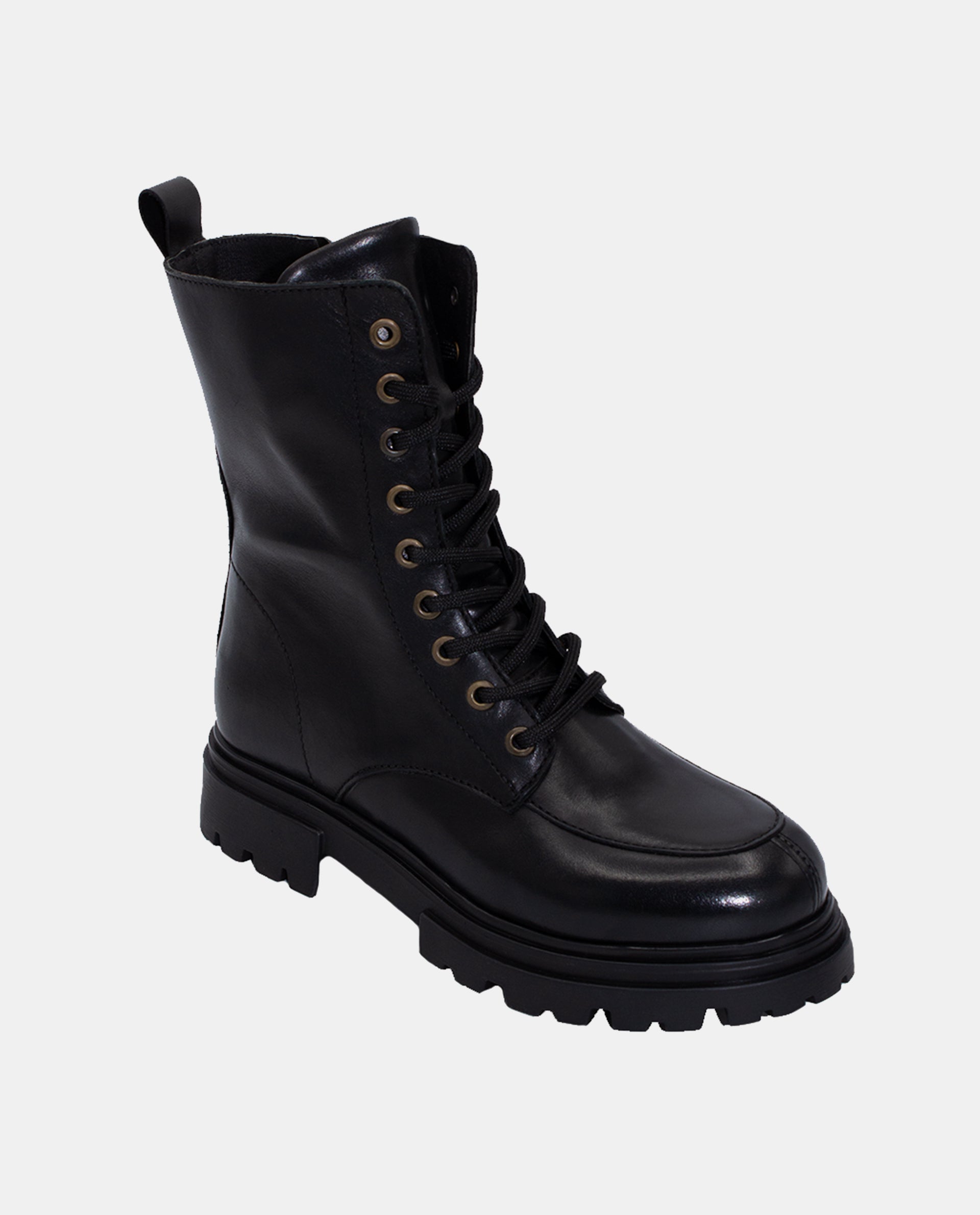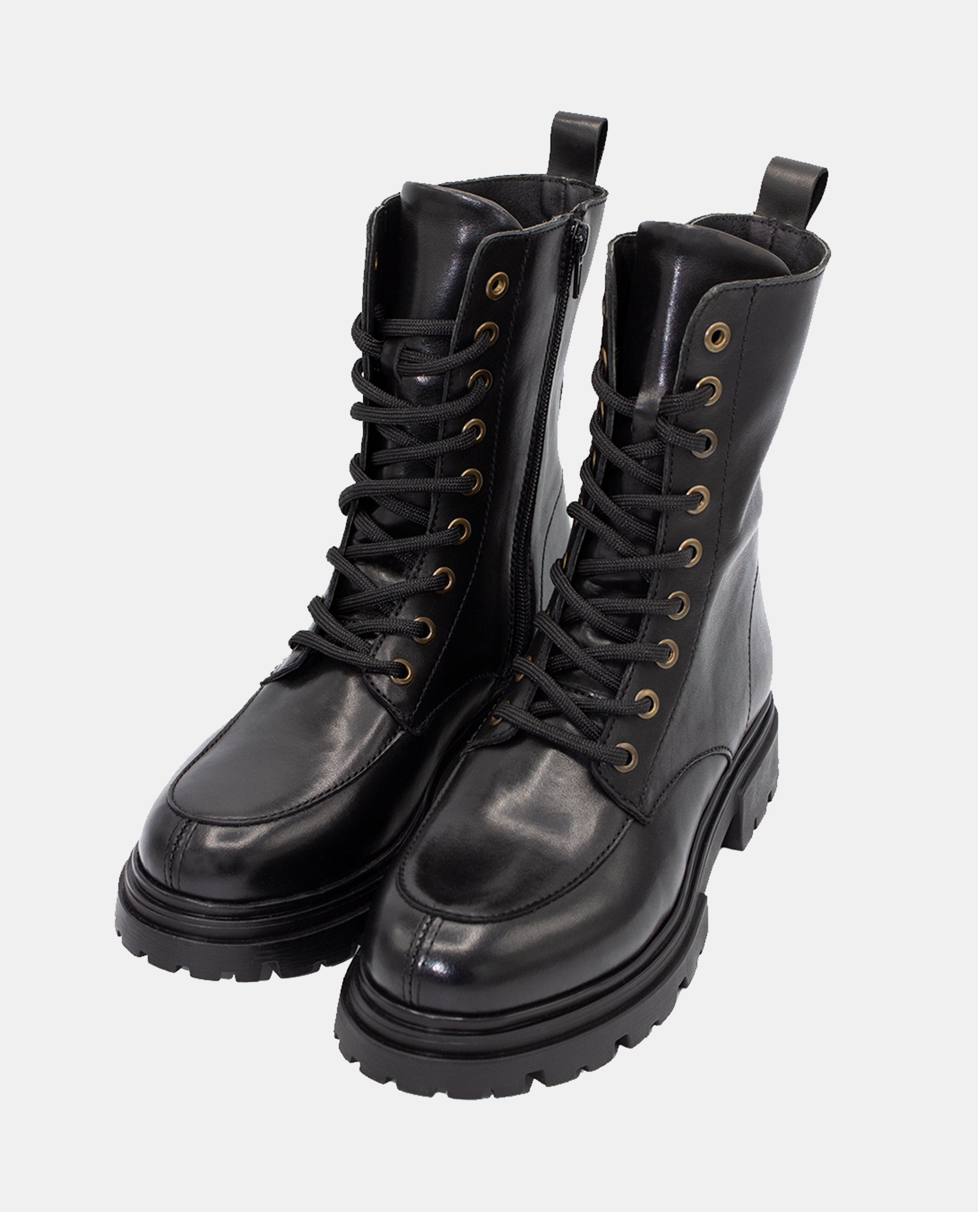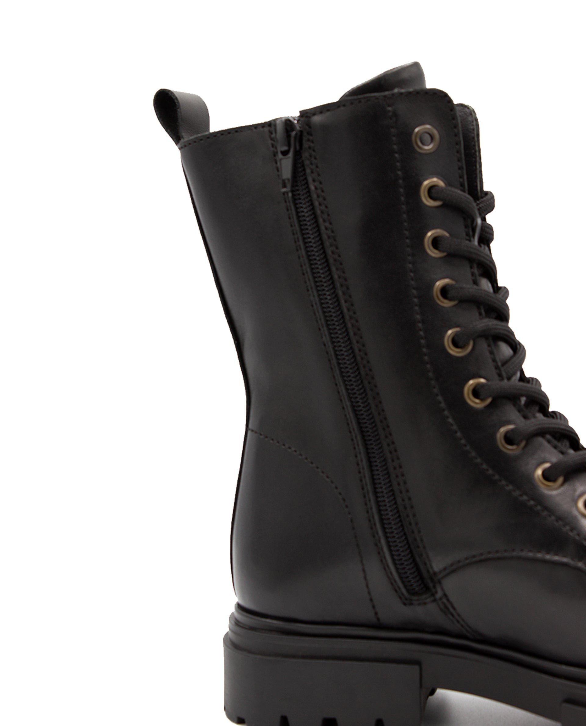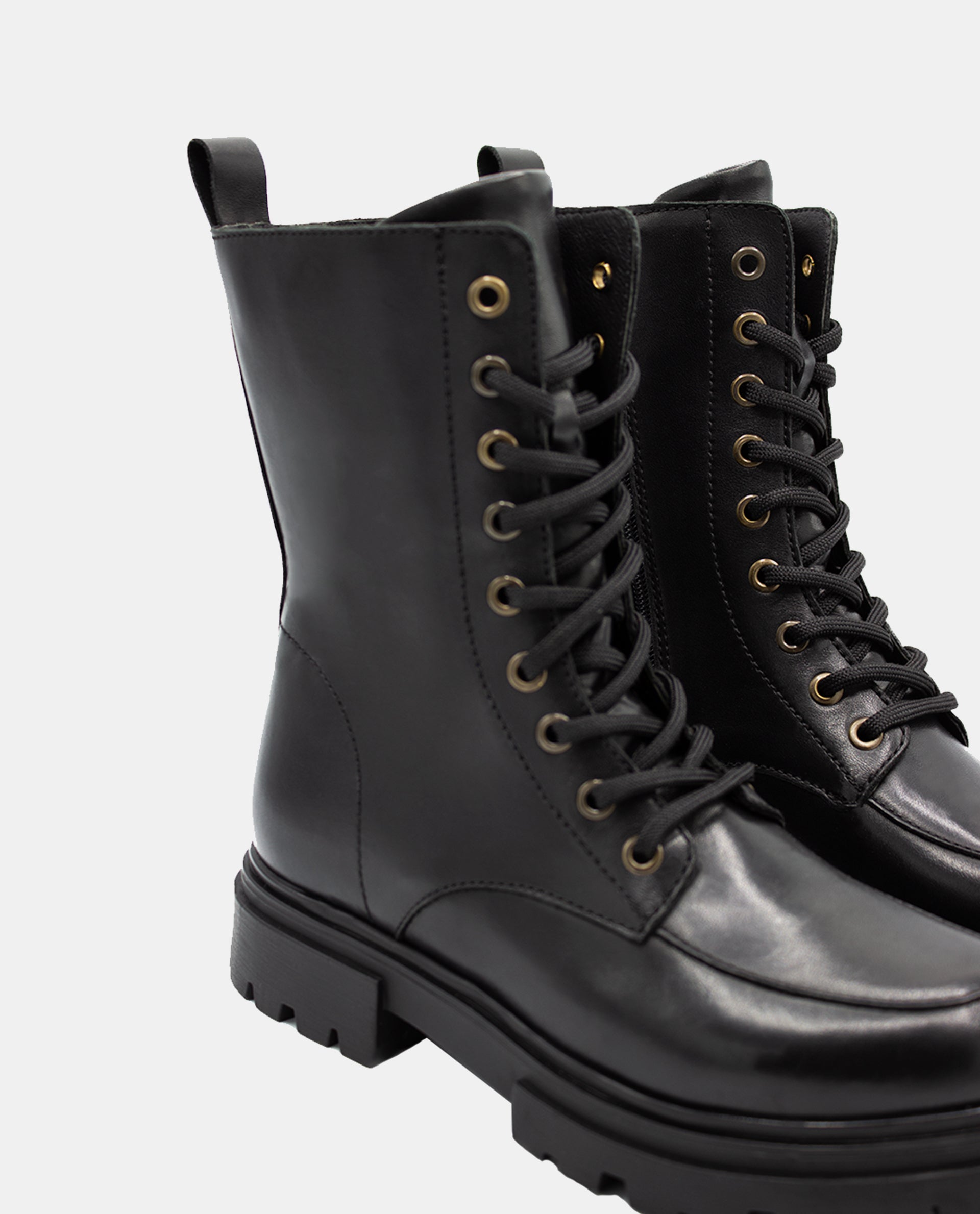 Crafted from smooth premium leather, the Black Leather Lace-Up Combat Boot blends utility and style with a timeless edge. Designed with classic lace-up detailing and a sturdy rubber sole, this boot ensures durability and comfort for everyday wear. Featuring a practical side zip closure for easy fitting, it’s a versatile piece that brings a bold yet polished finish to any look.